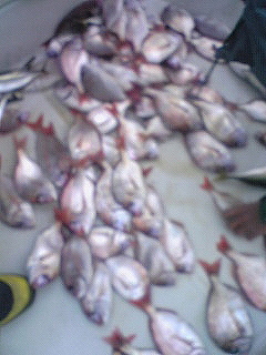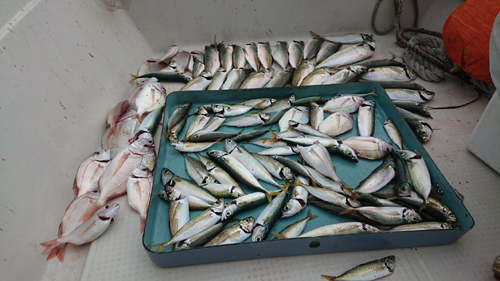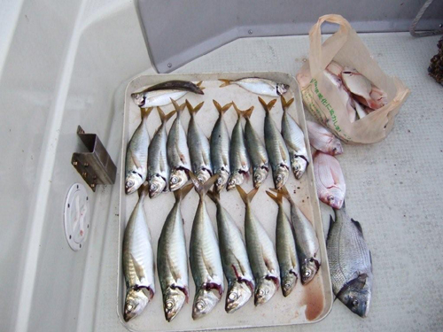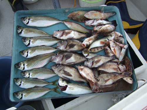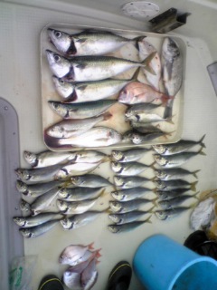 | 7月27日 大黒髪島にて鯵・鯖・他…朝から夕方まで粘りました。 朝は風雨が…白波も少々〜10時位からは 天気回復〜散発で入れ食いとはいかず、 長時間とにかく粘りと根性で何とか…でした。 ![]() |